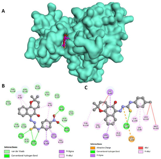 A significant number of hydrophobic interactions were also observed in the docking of the compound BV5 on GSK3β protein (Figure 7C), especially of the alkyl, pi–alkyl and pi–sigma type with Ile62, Val70, Ala83, Lys85, Met101, Leu132, Tyr134, Leu188, and Cys199. In addition, the sulfur of the thiosemicarbazone moiety was able to form hydrogen bonds with Gln185, and an attractive charge interaction was also observed between Asp200 and one of the thiosemicarbazone nitrogens.