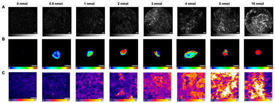 Fluorescence imaging of screened PSMA-914 doses in LNCaP tumor tissue 2 h p.i.. Representative images of (A) NIR-pCLE (in vivo, scale bar 20 μm, fluorescence intensity in arbitrary units, gray scale adjusted to min and max counts), (B) Odyssey CLx (ex vivo whole organs, scale bar 5 mm, raw fluorescence data are shown, color-coded by photon counts per pixel), and (C) confocal microscopy (ex vivo tissue cryosections, scale bar 20 μm, raw fluorescence data are shown, color-coded by photon counts per pixel) of 0/0.5/1/2/3/4/5/10 nmol PSMA-914 administered to LNCaP tumor-bearing mice (0 nmol (n = 3), 0.5/1/2/3/4/10 nmol (n = 1), 5 nmol (n = 2)) in the context of the dose finding study.