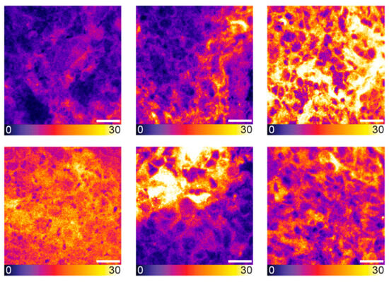 Heterogeneity in LNCaP tumor tissue as visualized by confocal microscopy. Exemplary confocal images of tumor tissue cryosections from LNCaP tumor-bearing mice, 2 h p.i. of 5 nmol PSMA-914 (n = 5). Scale bar 20 μm. Raw fluorescence data are shown, color-coded by photon counts per pixel.