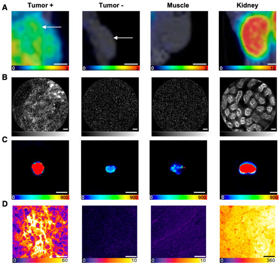 Multimodal imaging in the context of the in vivo proof-of-concept study. Representative images of (A) PET/MRI (coronal slices, in vivo, scale bar 2.5 mm, color scale in SUV values), (B) NIR-pCLE (in vivo, scale bar 20 μm, fluorescence intensity in arbitrary units, gray scale adjusted to min and max counts), (C) Odyssey CLx (ex vivo whole organs, scale bar 5 mm, raw fluorescence data are shown, color-coded by photon counts per pixel), and (D) confocal microscopy imaging (ex vivo tissue cryosections, scale bar 20 μm, raw fluorescence data are shown, color-coded by photon counts per pixel) of 5 nmol PSMA-914 in tumor, muscle, and kidney tissue of LNCaP and PC-3 xenograft-bearing mice, 2 h p.i. (n = 3, respectively).