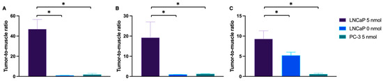 Tumor-to-muscle ratio of the fluorescence signal in NIR-pCLE and confocal microscopy. Tumor-to-muscle ratio of the median fluorescence signal (NIR-pCLE, in vivo) or the integrated fluorescence intensity (confocal microscopy, ex vivo tissue cryosections) detected in LNCaP and PC-3 tumor and muscle tissue, 2 h p.i. of 0 (n = 3) or 5 nmol PSMA-914 (n = 5, respectively) with (A,B) NIR-pCLE, using (A) CholangioFlexTM-C in vivo and (B) GastroFlexTM UHD-C ex vivo, and (C) confocal microscopy in ex vivo cryosections. Means were compared using Student’s t test. p-Values < 0.05 (*) were considered statistically significant.