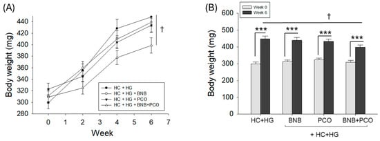 Effect of dietary intake of banaba (BNB, 0.1% w/w), policosanol (PCO, 0.1% w/w), and mixture of the banaba and policosanol (BNB+PCO, each 0.1% w/w) supplemented with high cholesterol (HC, 4% w/w) and high galactose (HG, 30% w/w) diet on the body weight of zebrafish. (A) Body weight changes over time (0–6 weeks), and (B) week 0 and week 6 body weights under respective dietary regimes. The † highlights the significant variance at p < 0.05 vs. HC+HG group, while *** represents the statistical difference between week 0 and week 6 among the respective groups.