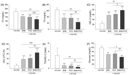 Concomitantly, the TG/HDL-C ratio was the highest and the lowest in the HC+HG group and PCO+BNB group, respectively (Figure 2E). These results suggest that the co-consumption of BNB+PCO showed a substantial effect in treating dyslipidemia by raising HDL-C and HDL-C/TC (%) and lowering the TG/HDL-C ratio compared with PCO or BNB alone.