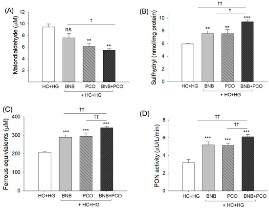 The highest MDA level (9.5 ± 0.5 μM) was detected in the HC+HG supplemented group, which was reduced to 7.5 ± 0.8 μM and 6.1 ± 0.5 μM by the intake of BNB and PCO, respectively. However, the most promising outcomes with the lowest MDA level (5.5 ± 0.3 μM) were observed in the BNB+PCO supplemented group, which was notably 36.4%, 11.0%, and 70.8% lower than the MDA level detected in the BNB, PCO, and HC+HG supplemented groups, respectively (Figure 3A).