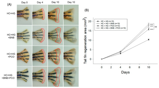 As shown in Figure 4A,B, a non-significant tail fin regeneration was observed between the groups up to 4 days post-amputation. With the progression of time up to 10 days post-amputation, the HC+HG group showed the lowest tissue regeneration (10.3 ± 0.4 mm2), while the BNB+PCO group exhibited the maximum level (18.5 ± 0.6 mm2) of the tail fin regeneration that was approximately 1.8-fold higher than the HC+HG group. Also, the BNB and PCO groups exhibited 1.5-fold and 1.7-fold higher tissue regenerations than the HC+HG group on day 10; nevertheless, they exhibited 5~14% lower tissue regeneration compared to the BNB+PCO group. These outcomes suggest that combined BNB and PCO intake significantly improved tissue regeneration relative to either PCO and BNB alone.