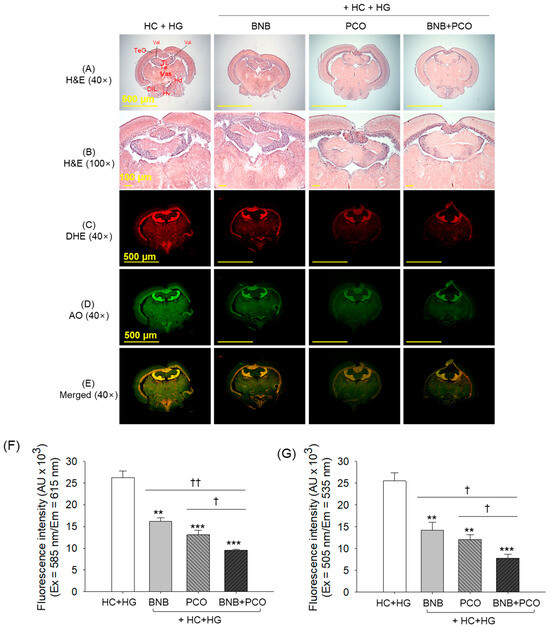 Brain histology after 6 weeks of consumption of banaba (BNB, 0.1% w/w), policosanol (PCO, 0.1% w/w), and mixture of the banaba and policosanol (BNB+PCO, each 0.1% w/w) supplemented with high cholesterol (HC, 4% w/w) and high galactose (HG, 30% w/w) diet. (A,B) Hematoxylin and eosin (H&E) staining at 40× and 100× magnification, respectively. (C) Dihydroethidium (DHE) staining. (D) Acridine orange (AO) staining and (E) merge images of DHE and AO staining. (F,G) Quantification of DHE and AO fluorescent intensities. The ** and *** underscore the significant variance at p < 0.01 and p < 0.001, vs. HC+HG group. The † and †† highlight significant differences at p < 0.05 and p < 0.01, vs. BNB+PCO.