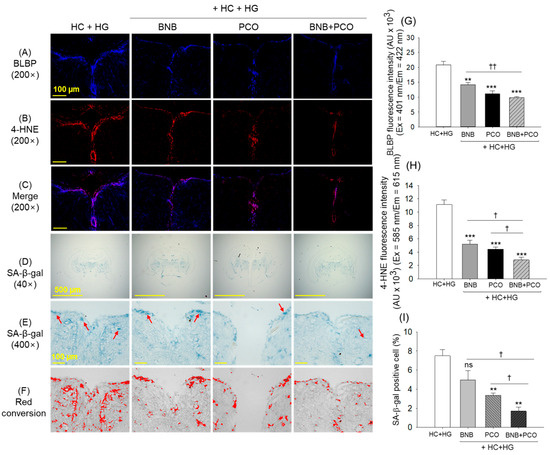 The SA-β-gal staining of the brain section (Figure 8D–F,I) revealed the highest blue stained area in the HC+HG group, corresponding to 7.5% of SA-β-gal positive cells mainly in the Vas region of the brain cortex. In contrast, the BNB+PCO group showed the least blue-stained area, approximately 1.7%, which was 78% lower than the SA-β-gal-stained area that appeared in the HC+HG group. The individual supplementation of PCO and BNB showed 54% (p < 0.01) and 34% lower SA-β-gal positive cells than the HC+HG group, respectively. These results suggest that the co-consumption of PCO and BNB exerted synergistic effects to prevent cellular senescence in the brain under the HC+HG diet.