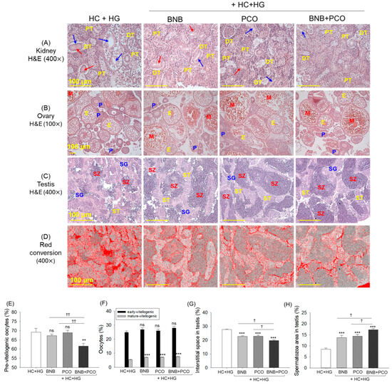 The H&E staining of the testis section displayed the loosely arranged seminiferous tubules, heightened interstitial space between the seminiferous tubules, and reduced spermatozoa in the HC+HG consumed groups (Figure 9C,D,G,H). These changes were substantially prevented by the consumption of BNB, PCO, and their combination (BNB+PCO). Notably, the combination of BNB+PCO displayed an appreciably higher protective effect compared to their individual supplementation, evident by the ~14% reduction in interstitial space between the seminiferous tubules and ~23% higher spermatozoa counts compared to the BNB and PCO supplemented groups, respectively.