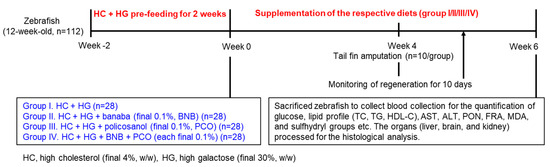 The study plan of a 6-week dietary intervention in zebrafish, incorporating a high-cholesterol (HC) and high-glucose (HG) diet infused with banaba (BNB), policosanol (PCO), or a combination of both (BNB+PCO).