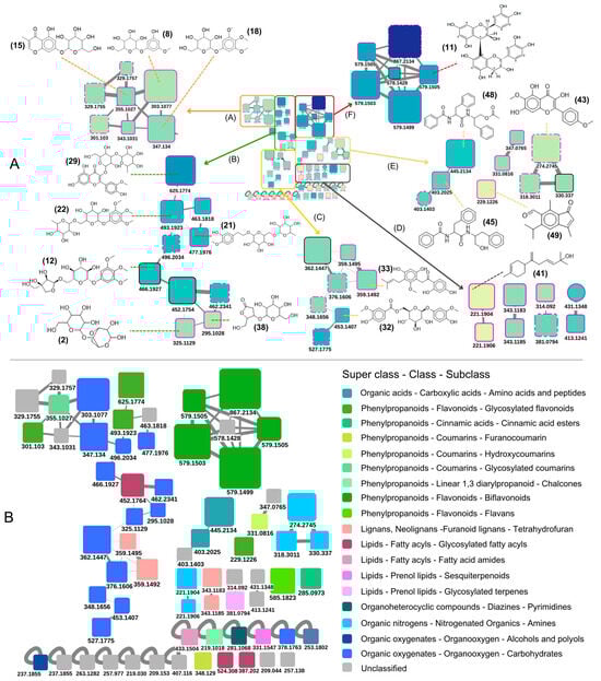 (A) Spectra Similarity Molecular Network (SSMN) of the [M+H]+ compounds detected in spectra of the aqueous extract of Commiphora leptophloeos by UPLC-MS/MS. The network was constructed using output files from the NP3 MS Workflow and visualized with Cytoscape v. 3.9.1. Each node (circles or squares) represents a consensus spectrum, which in this network is pointed out as the [M+H]+ ion (or a putative metabolite). Nodes are connected based on the similarity of their mass fragmentation spectra, forming clusters that might represent compounds sharing chemical similarity (e.g., from the same chemical family). Colors represent a range of m/z values (yellow = 200 Da, dark blue = 867 Da). Geometric forms and borders indicate the database source and quality of the chemical annotation. For a detailed description of the legend used, refer to Supplementary Figure S1. The letters A to F represent the clusters. Each m/z value is shown below the respective node in the SSMN, and annotated nodes are described in more detail in Table 1. (B) Class, superclass, and pathway of metabolites annotated in the [M+M]+ SSMN of the aqueous extract of Commiphora leptophloeos by UPLC-MS/MS. The different colors represent the classification of the compounds. Annotations from the GNPS database were considered in this analysis.