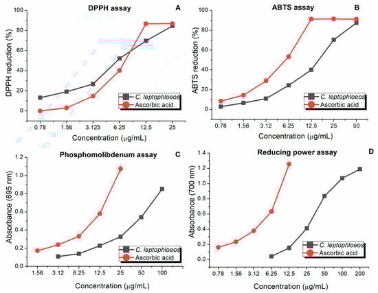 Average antioxidant activity of the aqueous extract of Commiphora leptophloeos bark. DPPH (A) and ABTS (B) results expressed as percentage scavenging, and phosphomolybdenum assay (C) and reducing power (D) results expressed as absorbance values. Ascorbic acid was used as a reference standard. All experiments were carried out in triplicates (n = 3). Error bars represent the standard deviation.