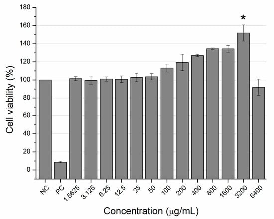 Cytotoxicity analysis after 24 h of exposure to the aqueous extract of C. leptophloeos bark revealed that none of the tested concentrations induced cytotoxicity in murine fibroblast cells (L929 cell line), as no significant reduction in cell viability was observed in the MTT assay. However, the 3200 μg/mL concentration statistically increased the cell viability, reaching 177.30% compared to the control (Figure 3).