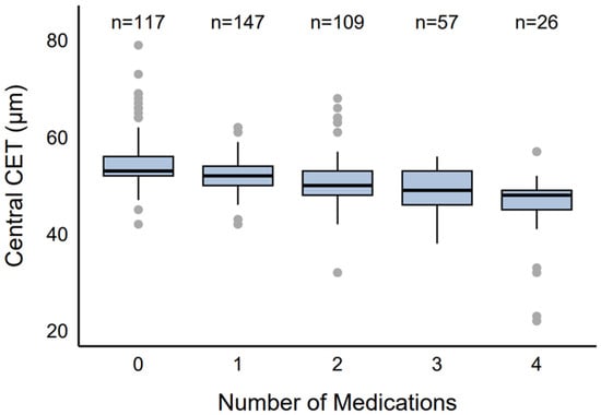CET varied by the number of medications used (Figure 1). The control group (0 medications, n = 117, 25.66%) showed a median CET of 53 µm (IQR: 52–56 µm, range: 42–79 µm). Eyes receiving monotherapy (n = 147, 32.24%) had a median CET of 52 µm (IQR: 50–54 µm, range: 42–62 µm), dual therapy (n = 109, 23.90%) had a median CET of 50 µm (IQR: 48–53 µm, range: 32–68 µm), triple therapy (n = 57, 12.5%) had a median CET of 49 µm (IQR: 46–53 µm, range: 38–56 µm), and quadruple therapy (n = 26, 5.70%) had the lowest median CET of 48 µm (IQR: 45–49 µm, range: 22–57 µm).