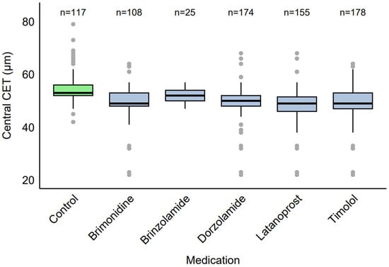 Among the eyes receiving therapy (n = 339), common medication combinations were identified. When examined by specific medication (Figure 2), eyes using brimonidine (n = 108, 31.86%) had a median CET of 49 µm (IQR: 48–53 µm, range: 22–64 µm), brinzolamide (n = 25, 7.39%) had a median CET of 52 µm (IQR: 50–54 µm, range: 47–57 µm), dorzolamide (n = 174, 51.33%) had a median CET of 50 µm (IQR: 48–52 µm, range: 22–68 µm), latanoprost (n = 155, 45.72%) had a median CET of 49 µm (IQR: 46–51.5 µm, range: 22–68 µm), and timolol (n = 178, 52.51%) had a median CET of 49 µm (IQR: 47–53 µm, range: 22–64 µm).