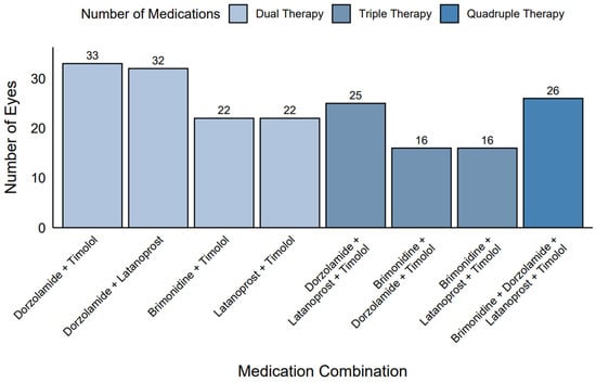 Among the eyes receiving polytherapy (n = 192), common medication combinations were identified (Figure 3). In the dual therapy group (n = 109), the most frequent combinations were dorzolamide + timolol (30.3%, n = 33), dorzolamide + latanoprost (29.4%, n = 32), brimonidine + timolol (20.2%, n = 22), and latanoprost + timolol (20.2%, n = 22). In the triple therapy group (n = 57), dorzolamide + latanoprost + timolol was the most common combination (43.9%, n = 25), followed by brimonidine + dorzolamide + timolol and brimonidine + latanoprost + timolol (28.1%, n = 16). All eyes in the quadruple therapy group (n = 26, 100%) used the combination of brimonidine + dorzolamide + latanoprost + timolol.