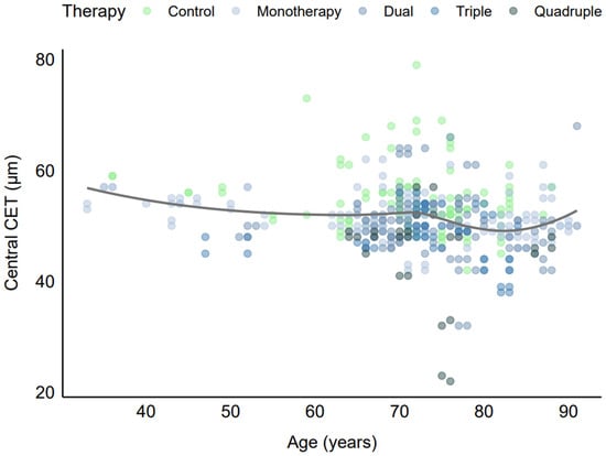 A strong inter-eye correlation in CET (Rho = 0.82) was observed, indicating high within-patient similarity. Spearman’s rank correlation coefficients showed weak associations between CET and age across medication groups: control (Rho = −0.17, p = 0.061, n = 117), monotherapy (Rho = −0.27, p = 0.001, n = 147), dual therapy (Rho = −0.06, p = 0.524, n = 109), triple therapy (Rho = −0.29, p = 0.027, n = 57), and quadruple therapy (Rho = −0.29, p = 0.145, n = 26). The monotherapy group’s significant correlation (p = 0.001) indicated a weak negative association, with older age linked to slightly thinner CET, though the effect size (Rho = −0.27) was modest. The triple therapy group also showed a significant weak negative association (p = 0.027, Rho = −0.29). In the quadruple therapy group, the correlation coefficient (Rho = −0.29) was identical to that of triple therapy, but the non-significant p-value (p = 0.145) was likely due to the smaller sample size (n = 26). Visual inspection of the scatter plot (Figure 4) revealed a relatively flat locally estimated scatterplot smoothing (LOESS) across the age range (33–90 years), confirming the absence of a consistent trend.