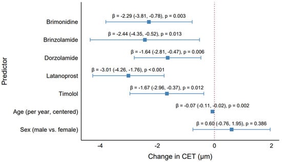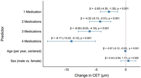 Age was also a significant predictor, with each additional year (centered at the median [75 years]) associated with a CET reduction of 0.07 µm (95% CI: −0.12 to −0.03, p < 0.001). This small but significant effect aligns with the weak negative correlation observed in the descriptive analyses (e.g., Rho = −0.27, p = 0.001 for monotherapy), revealing a subtle age-related thinning of the corneal epithelium. However, the clinical impact of this effect was minimal compared with the medication effects, as a 10-year age difference corresponded to only a 0.70 µm reduction in CET. Sex was not significant (β = 0.44 µm, 95% CI: −0.84 to 1.71, p = 0.500), with the forest plot showing its confidence interval crossing the null line (β = 0), indicating no meaningful difference between males and females.