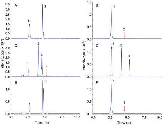 Representative total ion chromatograms of ginsenoside Re, Ro and their transformed products using alkali, acid and MCCs, The chromatograms (TICs) are the sum of the detector responses of all the ions listed in the Supplementary Materials. (A) Chromatogram of the reference materials. (B) Control, Re aqueous solution incubated in a 90 °C water bath for 6 h. (C) Ginsenoside Re transformed products in 0.5 ppm sulfuric acid (v/v, 9.2 μM, Ro was added as a reference). (D) Ginsenoside Re transformed products in 0.5 ppm sodium carbonate (w/v, Ro was added as a reference). (E,F) Ginsenoside Re transformed products catalyzed by commercially available microcrystalline celluloses: 1, Re; 2, 20(R/S)-Rg2; 3, Ro; 4, zingibroside R1.