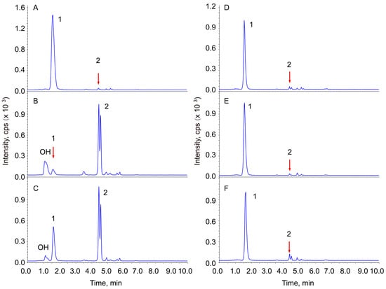 Effect of native or partially hydrolyzed cellulose on ginsenoside Re hydrolysis. The chromatograms are the TICs: (A) control; (B) cotton wool immersed in HCl without heating incubation (0 h); (C) MCC-C; (D) supernatant of MCC-C; (E) MCC-Cn1; (F) MCC-Sn1. 1, Re; 2, 20(R/S)-Rg2. OH represents a group of products of Re produced from an additional reaction at the Δ (23, 24) double bond with H2O.