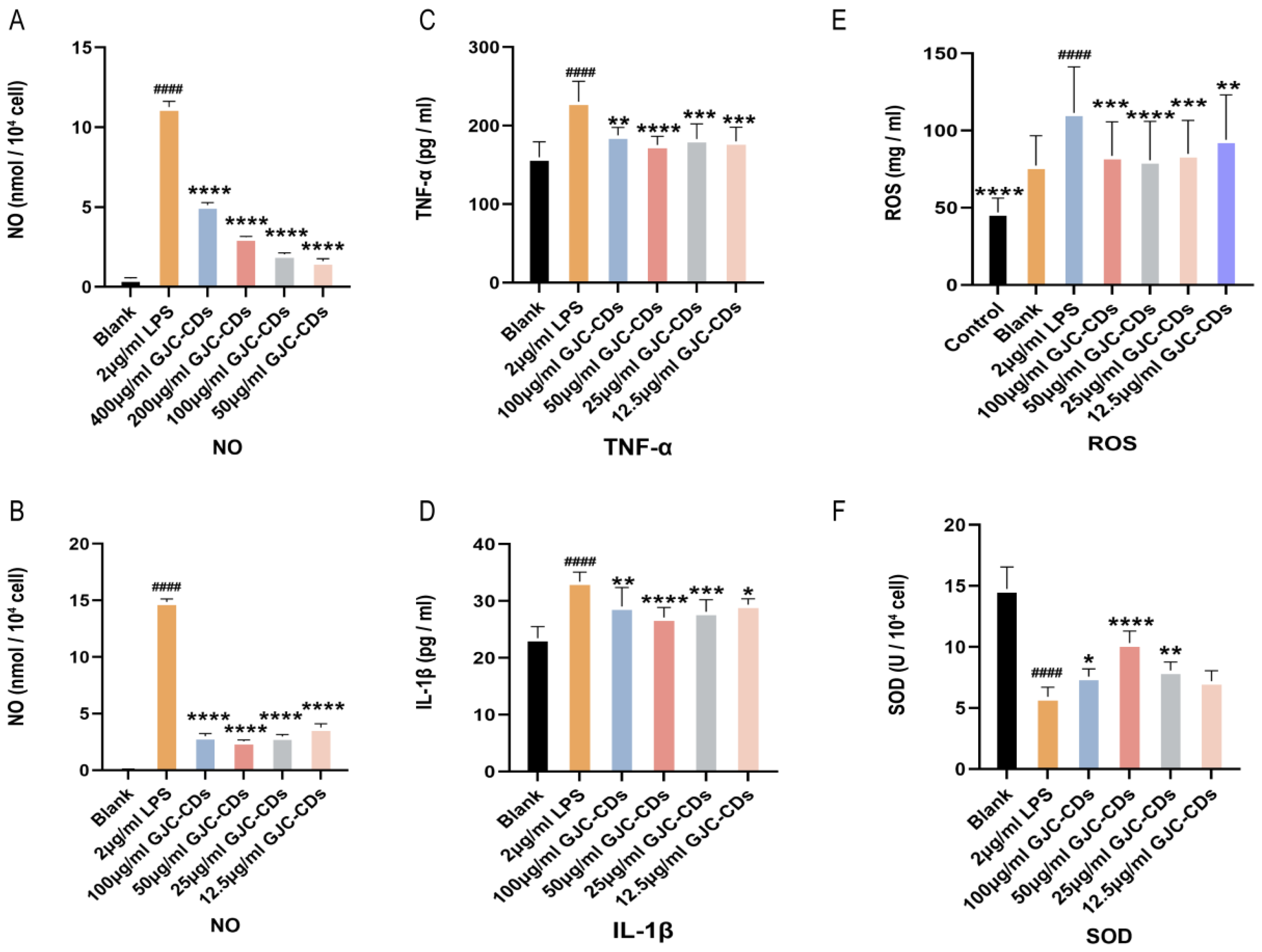 The BV2 cell line was obtained from the Cell Resource Center of the Institute of Basic Medical Sciences, Chinese Academy of Medical Sciences. BV2 cells were routinely cultured in a standard incubator (37 °C, 5% CO2, unrestricted O2) using complete medium (DMEM supplemented with 10% FBS). They were pre-inoculated into 6-well plates prior to experimentation. After 24 h of acclimatization, BV2 cells were pretreated with varying concentrations of GJC-CDs for 12 h to assess their anti-inflammatory effects. Subsequently, cells were stimulated with lipopolysaccharide (LPS) for 12 h, followed by corresponding treatments based on specific experimental indicators.
