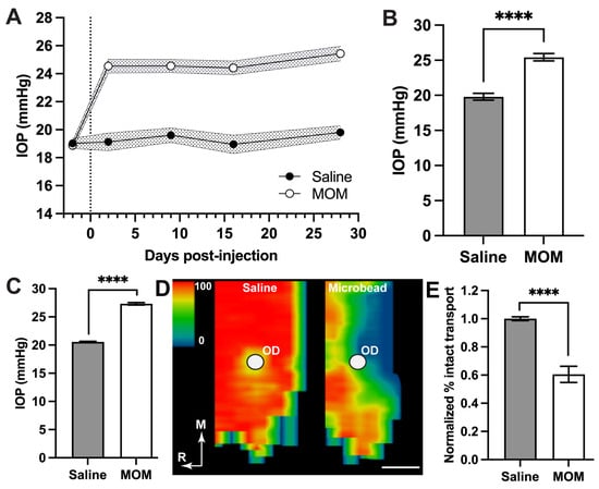 Baseline IOP measurements were taken for several days prior to bilateral microbead occlusion or saline injection (Figure 1). Microbead occlusion elevated IOP by an average of 29% in microbead eyes compared to saline over the 4-week experimental period (19.80 ± 0.48 vs. 25.44 ± 0.53 mmHg; Figure 1A,B; p < 0.0001). This elevation is similar to our historical IOP measurements published from rats for the same 4-week period (Figure 1C), which we have shown results in a 40% reduction in anterograde transport of cholera toxin B (CTB) from the retina to the superior colliculus along the optic nerve (Figure 1D,E; [35,36]). Degradation of active transport of CTB is an early event marking optic nerve degeneration in models of glaucoma, preceding frank degeneration of both retinal ganglion cells and their axons [37,41]. Thus, our choice of a 4-week period of IOP elevation is relevant to the progression of neurodegeneration in this model of glaucoma.