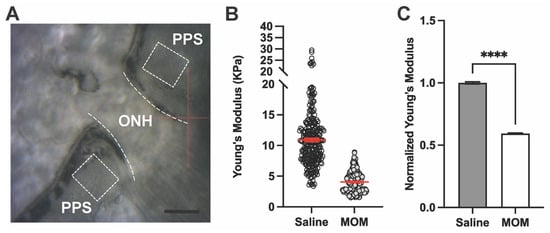 IOP elevation decreases Young’s modulus of the peripapillary sclera (PPS). (A) AFM microscope view showing optic nerve head (ONH; dashed lines) and PPS (dashed boxes) regions of interest. Scale bar = 200 μM. (B) Representative Young’s modulus values from one PPS location for each condition in one animal, saline vs. MOM (n = 256 data points per condition). Red lines indicate data means ± SEM. (C) Mean Young’s modulus from PPS across all biological repeats normalized with respect to saline eye measurements (unpaired t-test with Welch’s correction; ****, p < 0.0001). Data are presented as means ± SEM.