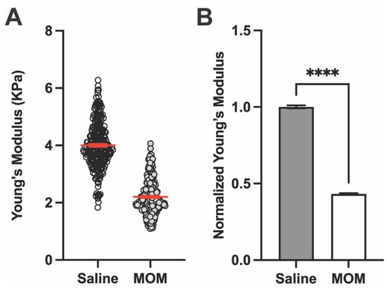IOP elevation decreases Young’s modulus of the glial lamina. (A) Representative Young’s modulus values from one GL location for a saline vs. MOM animal (n = 256 data points each). Red lines indicate mean ± SEM. (B) Young’s modulus from GL across all biological repeats normalized with respect to saline eye measurements (Unpaired t-test with Welch’s correction; **** p < 0.0001). Data presented as means ± SEM.
