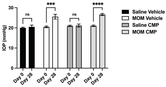 Intraocular pressure (IOP) elevation in rats with microbead injection and topical vehicle or CMP. Mean IOP at baseline (Day 0) and 4 weeks following bilateral saline or microbead injection with either topical vehicle or CMP. Animal numbers as described in Methods. Saline-injected eyes with vehicle or CMP treatment did not exhibit IOP elevation (ns; p = 0.640 and p = 0.900, respectively). Microbead-injected eyes with vehicle treatment showed elevated IOP compared to baseline (***, p = 0.0002), as did those with CMP treatment (****, p < 0.0001). IOP at week 4 did not differ between MOM vehicle and CMP groups (p = 0.440). Data are presented as means ± SEM. (2-way ANOVA).