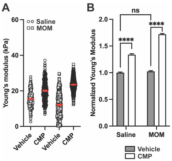 CMP increases PPS Young’s modulus after saline and microbead injection. (A) Representative Young’s modulus for PPS from one section each from saline and MOM eyes receiving either vehicle or CMP (for vehicle, n = 2560 measurements for saline and 768 for MOM; for CMP, n = 2560 measurements for saline and 5120 for MOM). In the vehicle group, MOM decreased Young’s modulus vs. the saline eye. In the CMP group, treatment increased Young’s modulus for both saline and MOM eyes compared to vehicle, though the effect was greater in MOM PPS vs. saline. Red lines indicate mean ± SEM. (B) Young’s modulus normalized to vehicle-treated saline eyes from all biological repeats (One-way ANOVA; ****, p < 0.0001). Data are presented as means ± SEM.