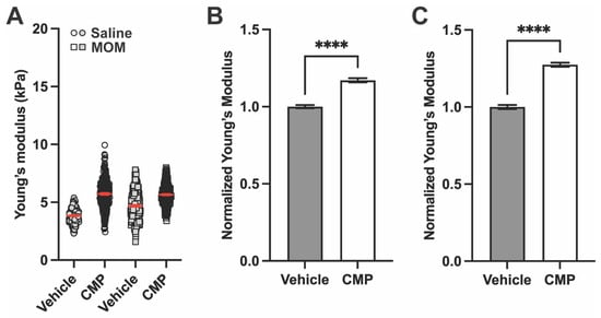 CMP increases stiffness of the GL after saline and microbead injection. (A) Representative Young’s modulus values from one section for each group (n = 1536 measurements for saline vehicle, 1526 for saline CMP, 768 for MOM vehicle, and 3072 for MOM CMP). In the CMP group, treatment increased Young’s modulus for both saline and MOM eyes compared to vehicle. Red lines indicate mean ± SEM. Young’s modulus data normalized to saline vehicle control from all biological repeats in (B) saline-injected and (C) microbead-injected eyes (One-way ANOVA; **** p < 0.0001). Data are presented as means ± SEM.