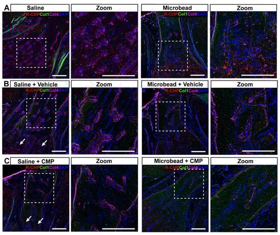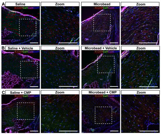 Fragmented collagen in peripapillary sclera. Representative confocal micrographs of PPS from a (A) saline (left) and microbead (right) eye without treatment labeled with antibodies to collagen I (green) and collagen IV (magenta) together with R-CHP (red) to detect fragmented collagen. Cell nuclei shown by DAPI staining (blue). Dashed boxes represent zoomed regions of interest. (B) In vehicle-treated PPS from microbead eyes, collagen I and R-CHP tend to increase, while CMP treatment (C) tends to reduce the area labeled by R-CHP. Scale bars = 100 μm.