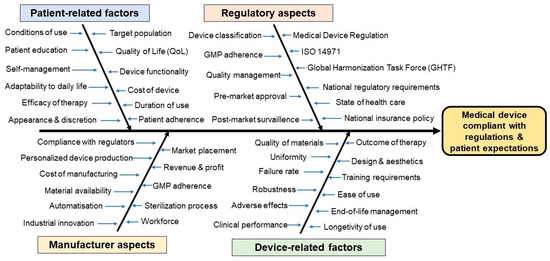 Ishikawa diagram on the main factors affecting the development of medical devices compliant with regulations and patient expectations. Abbreviations used: QoL—Quality of Life; ISO—International Organization for Standardization; GMP—Good Manufacturing Practice; GHTF—Global Harmonization Task Force.