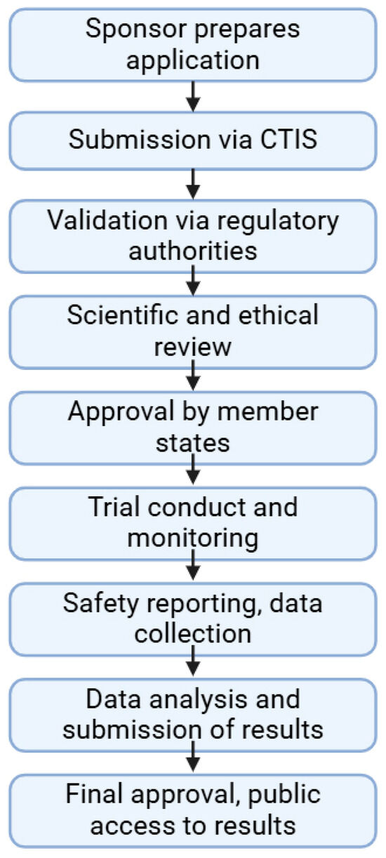 Schematics of the steps of clinical trials for medicinal products according to Clinical Trials Regulation No. 536/2014. Abbreviation used: CTIS—Clinical Trials Information System. Created in BioRender. Sipos, B. (2025) https://BioRender.com/qby0lpe.