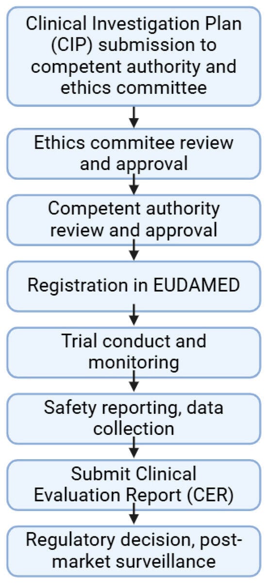 Ethical approval is also based on multiple factors, including the scientific evaluation of the proposed trial, its risk–benefit analysis, the qualifications of investigators, and finally, the assessment of the informed consent procedures and documentation. The average approval time lies between 60 and 90 days if all safety and regulatory requirements are met, followed by registration in the EUDAMED database to ensure publicly accessible data. The results of the trial must be collected together into a Clinical Evaluation Report (CER), which is a critical document according to the MDR. The structure of the report must be made in alignment with MDR Annex XIV Part A to ensure a systematic approach to clinical evaluation. The CER must include the clinical background of the medical device investigated from design characteristics, intended use and clinical applications. The statistical analysis must also be performed in a manner that it can be comparable with prior devices (if they exist). As it is a living document, all new data from post-market surveillance and adverse effects must be added into the document. A schematic on the authorization and clinical trial process can be found in Figure 3.