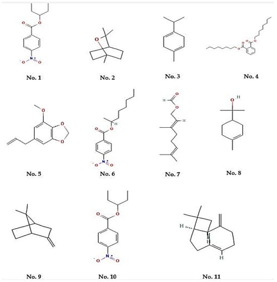 Structure of major compounds identified in an MEO. (No. 1) 4-Nitrobenzoic acid, 3-pentyl ester, (No. 2) Eucalyptol, (No. 3) 1,4-cyclohexadiene, 1-methyl-4-(1-methylethyl), (No. 4) Di-n-octyl phthalate, (No. 5) 1,3-Benzodioxole, 4-methoxy-6-(2-propenyl), (No. 6) 4-Nitro-benzoic acid, 1-methyl-heptyl ester, (No. 7) 2,6-octadien-1-ol, 3,7-dimethyl-, formate, (e)-, (No. 8) 3-cyclohexene-1-methanol, .alpha.,.alpha.,4-trimethyl, (No. 9) Bicyclo[2.2.1]heptane, 7,7-dimethyl-2-methylene-, (No. 10) 4-Nitrobenzoic acid, 3-pentyl ester, and (No. 11) Caryophyllene.