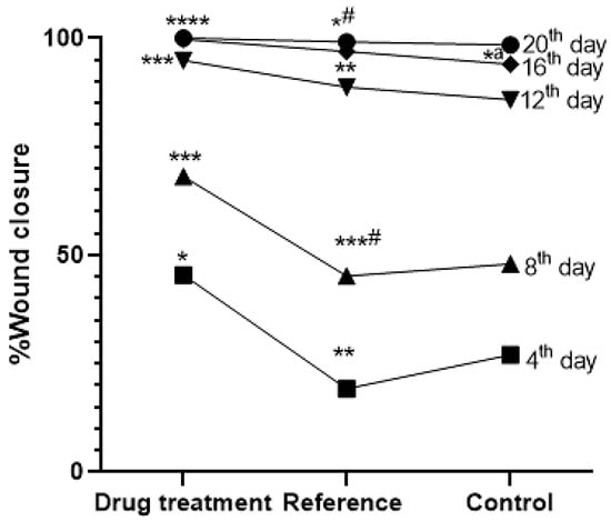Impact of MEO on wound closure percentage in reference and control groups. n = 6; group, **** p < 0.0001 MEO vs. control, *** p < 0.005 MEO vs. control, ***# p < 0.005 MEO vs. reference group, ** p < 0.05 MEO vs. reference group, * p < 0.05 MEO versus control group, *# p < 0.05. MEO vs. reference group, and *a p < 0.05 reference vs. control group. Tukey’s multiple comparison test was conducted after applying a one-way ANOVA for data analysis. p-values below 0.05 are considered significant.