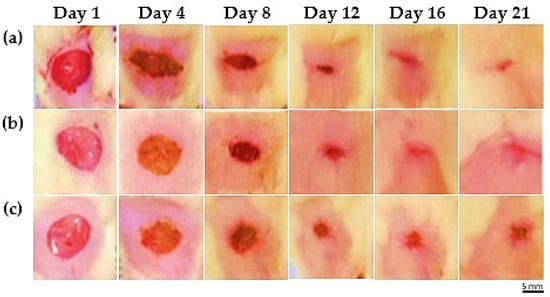 Representative images showing wound healing among the various groups. (a) The MEO group, (b) reference group, and (c) control group showed signs of wound healing throughout time, as seen by typical photos taken between Days 1 and 21. By the conclusion of the observation period, the MEO treatment group had achieved complete epithelialization and shown accelerated wound healing. Scale bar = 5 mm; applies to all panels. Calibration is based on the known initial wound diameter of 20 mm on Day 1.
