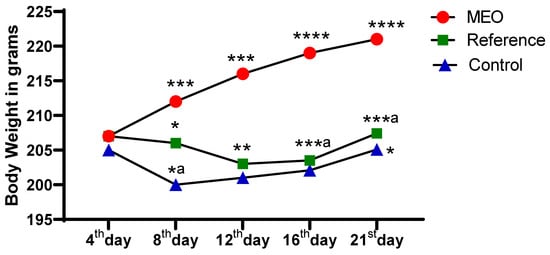 Impact of MEO on body weight compared to the reference and control groups. n = 6; mean ± SEM, * p < 0.05 MEO vs. reference, *a p < 0.05 reference vs. control, ** p < 0.05 MEO vs. reference, *** p < 0.005 MEO vs. control, and ***a p < 0.005 MEO vs. reference group; **** p < 0.0001 MEO vs. control group are the corresponding values. Tukey’s multiple comparison test was conducted after the data analysis using a one-way ANOVA. p-values below 0.05 are considered statistically significant.
