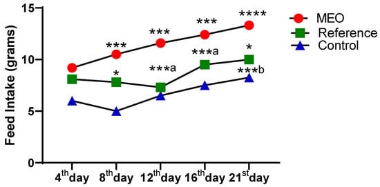The observed difference in body weight is closely related to feed intake. Each day at 8:00 a.m., feed was weighed and provided to the animals. The next morning, the remaining feed was measured to calculate the daily feed intake. As shown in Figure 5, feed intake also steadily increased in the MEO group, displaying statistically significant differences (*** p < 0.005 to **** p < 0.0001) across all days when compared to the other groups. In contrast, the reference group showed a moderate increase, and the control group exhibited the least improvement. This pattern highlights a direct correlation between nutritional intake and weight gain, with the MEO group consistently outperforming the others.