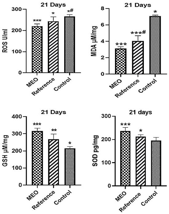 The effects of MEO on ROS, MDA, GSH, and SOD in comparison to the reference and control groups. ** p < 0.05 reference compared to control group, *** p < 0.005 drug compared to control group, * p < 0.05 drug compared to reference group, *# p < 0.05 reference compared to control, and ***# p < 0.005 reference compared to control group, with n = 6 indicating the values, presented as mean ± SEM. Tukey’s multiple comparison test was performed following the one-way ANOVA data analysis. p-values of less than 0.05 are considered statistically significant.