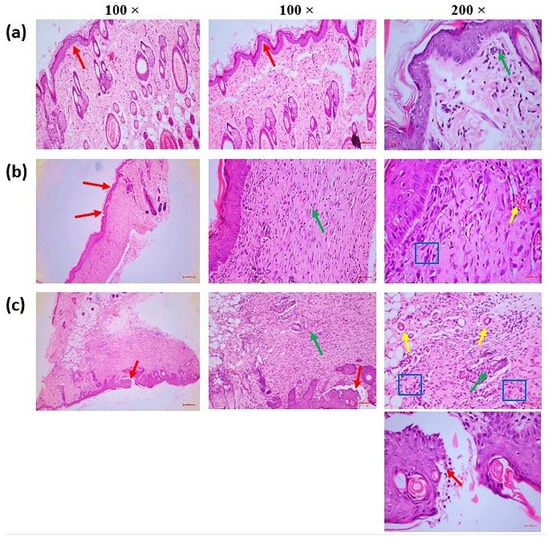 (a) MEO treatment—total restoration of the epithelium (red arrow) and dermis, with minimal infiltrating inflammatory cells (green arrow). (b) Reference: The impacted areas exhibited complete re-epithelialization alongside epidermal hyperplasia (red arrow) and a moderate inflammatory response, characterized by granulation tissue proliferation in the superficial region adjacent to the injury site (green arrow). Additionally, fewer than five blood vessels per high-power field defined moderate angiogenesis or neovascularization (yellow arrow). The region contiguous to the epidermis was substituted. Fibroblasts (blue square) that make collagen and other extracellular matrix components, a network of tiny blood vessels (yellow arrow—capillaries), and different inflammatory cells (green arrow), primarily plasma cells and lymphocytes, followed by neutrophils, are all part of thick granulation tissue. (c) Control: Incomplete wound healing is characterized by inadequate re-epithelialization at the wound site and an overabundance of necrotic debris and inflammatory exudates in the epidermal layers (Red arrow). A considerable inflammatory response with granulation tissue growth was observed in the dermal region around the incision (green arrow), along with pronounced angiogenesis, evidenced by 5 to 10 blood vessels per high-power field (yellow arrow). The area surrounding the epidermal lesion was substituted with granulation tissue, consisting of a network of capillaries (yellow arrow), fibroblasts (blue square) that synthesize collagen and other extracellular matrix components, and various inflammatory cells (green arrow), primarily neutrophils, in addition to plasma cells and lymphocytes.