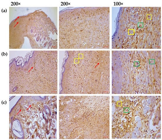 Immunohistochemical assessments of Caspase-3 activation among each of the groups. (a) MEO-treated group: Caspase-3 expression appeared at normal levels in the fully re-epithelialized epidermal and dermal regions (indicated by red arrows). Normal nucleo-cytoplasmic staining of caspase-3 was evident in the granulation tissue, particularly within fibroblasts (green square) and among infiltrating immune cells, including neutrophils, plasma cells, and lymphocytes (yellow square), located in both the epidermal and dermal layers. (b) Reference group: A moderate level of caspase-3 expression was observed in the healed skin, specifically within the epidermis and dermis (red arrows). Granulation tissue showed moderate nucleo-cytoplasmic caspase-3 localization, primarily in fibroblasts (green square) and immune cells such as neutrophils, plasma cells, and lymphocytes (yellow square), spread across the skin layers. (c) Control group: Caspase-3 expression was limited to a mild level in the re-epithelialized epidermis and dermis (red arrows). Weak nucleo-cytoplasmic caspase-3 staining was detected in fibroblasts (green square) and immune cells (yellow square) within the granulation tissue of both skin layers.