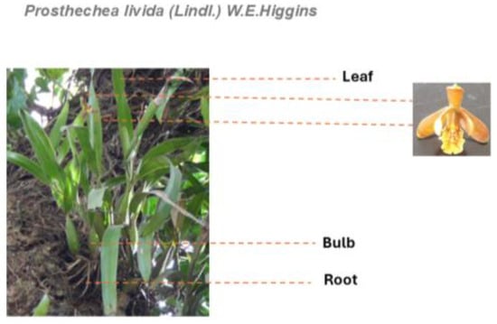 Prostachea livida (Lindl.) W.E.Higgins is an epiphytic orchid with an elliptical pseudobulb and one or two apical leaves (Figure 1). It blooms throughout the year, with an apical inflorescence measuring 4 to 11 cm and producing 3 to 7 flowers. This orchid is found in humid and seasonally dry forests, forming mats on trees, cacti, and rocks. It is distributed across a number of States of Mexico, such as Chiapas, Oaxaca, San Luis Potosí, Tabasco, Tamaulipas, and Veracruz [14].