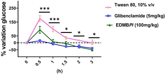 Effect of EDMBPl on blood glucose after a single oral load of 2 g/kg of glucose in male normoglycemic mice n = 6 at 0.5, 1, 1.5, 2, and 3 h, compared to the vehicle. Statistically significant differences between the treatments were tested by two-way ANOVA, followed by a Tukey t-test. * p = 0.01,0.04, *** p < 0.001.