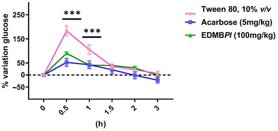 A population of 18 mice was used, which were fasted for 8 h with free access to water. Subsequently, 3 experimental groups were formed (n = 6 each). The initial blood glucose (T0) was measured with a glucometer (Accu-Chek guide, Roche, Basel, Switzerland) for each group, the positive control group (glibenclamide 5 mg/kg or acarbose 3 mg/kg), the EDMBPl group (100 mg/kg), and the vehicle group (Tween 80, 10% v/v), 30 min after oral glucose or sucrose (2 g/kg) was administered. Additionally, blood samples were collected from the caudal vein 0, 0.5, 1, 1.5, 2, and 3 h after the administration of the vehicle, positive control, and extract. The percentage variation in glycemia for each group was calculated concerning the initial (0 h) value, according to the formula: %Variation of glycemia = [(Gx − G0)/G0] × 100, where G0 represented the initial glycemia values, and Gx represented the glycemia values at each time, as described [34].