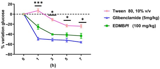 Evaluation of the antidiabetic activity of EDMBPl on blood glucose in streptozotocin-nicotinamide-induced diabetic mice, where a glucose reduction is observed at 1, 3, 5, and 7 h compared to the positive control n = 6. Statistically significant differences between the treatments were tested by two-way ANOVA, followed by a Tukey test. * p = 0.04, *** p < 0.001.