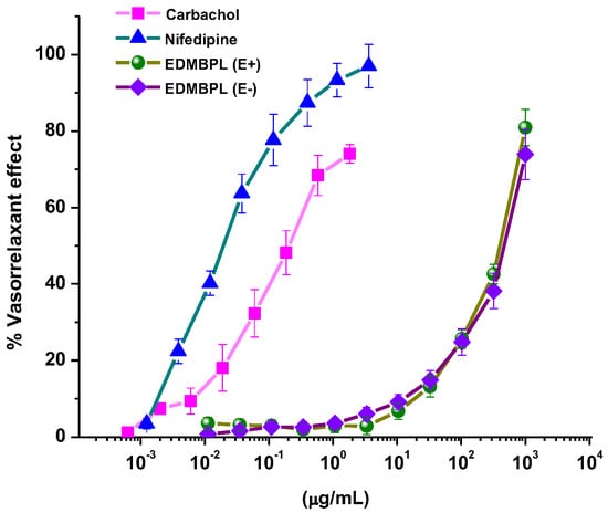 In addition to our experiments on diabetes, we aimed to investigate whether EDMBPl had a hypertensive effect due to its potential relationship with this disease. Therefore, EDMBPl was tested on rat aortic rings to evaluate its vasorelaxant effect. As shown in Figure 5, EDMBPl shows a concentration-dependent effect in the presence of endothelium, with a maximum effect (Emax) of 80.9 ± 4.7% and effective concentration 50 (EC50) of 502.5 ± 2.5 µg/mL. In the absence of endothelium, the maximum effect was Emax = 73.9 ± 6.5% with an EC50 = 536 ± 4.6 µg/mL. The similar response observed in both conditions suggests that the extract may exert its vasorelaxant effect directly on the vascular smooth muscle [25].