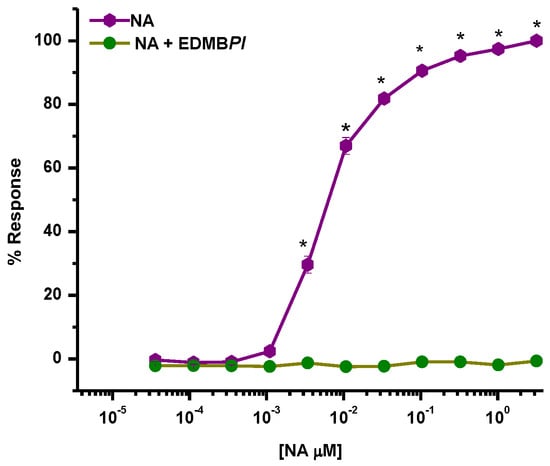 Effect of EDMBPl on the contraction induced by NA (0.1 nM to 0.1 μM) in aortic rings without the endothelium, where a significant difference is seen in the percentage of responses induced by NA. Each point represents the mean ± S.E.M. for five animals. A statistical difference was considered when * p < 0.05.