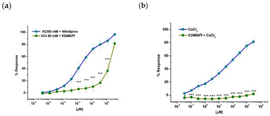 In Figure 7a, pre-incubation with the EC50 of EDMBPl followed by a concentration–response curve (CRC) to CaCl2-induced contraction can be observed; the extract avoided contraction, suggesting an effect on the smooth muscle of blood vessels via calcium channel blockade [29]. This is further confirmed by the CRC for the administration of 80 mM KCl, which led to membrane hyperpolarization through BKCa, allowing calcium entry through Cav 1.2 calcium channels.
