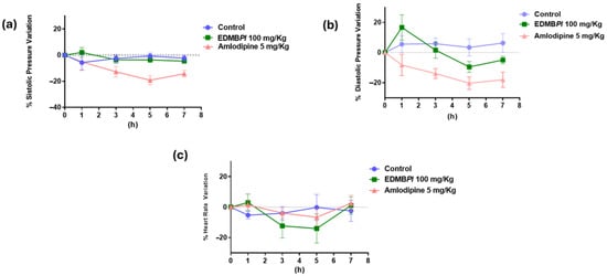 An antihypertensive activity study of EDMBPl was conducted in SHRs. Animals were allotted into three groups (six animals each): control rats (CR, group 1), positive control (amlodipine 5 mg/kg, group 2), and treated rats (EDMBPl 100 mg/kg, group 3). The treated group received a single intragastric dose of EDMBPl (100 mg/kg). Measurements [blood pressure and heart rate (HR)] were recorded before and after the treatment of the test compound at 0, 1, 3, 5, and 7 h using a tail cuff method (LE 5001 automatic blood pressure meter, (PanLab™ Harvard Apparatus, Barcelona, Spain)). The percentage decrease in HR, SBP, and DBP was calculated.